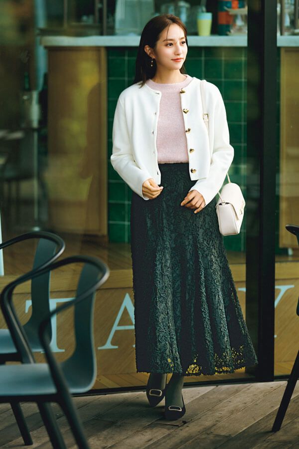 ニット¥13,200/アプワイザー・リッシェ ニットジャケット¥9,493/NATURAL BEAUTY BASIC スカート¥15,400/Noëla ピアス¥17,900/miyu nakamura(ロードス) バッグ¥15,180/JILL by JILLSTUART タイツ¥759/チュチュアンナ 靴¥12,650/ル タロン(ル タロン 有楽町マルイ店)