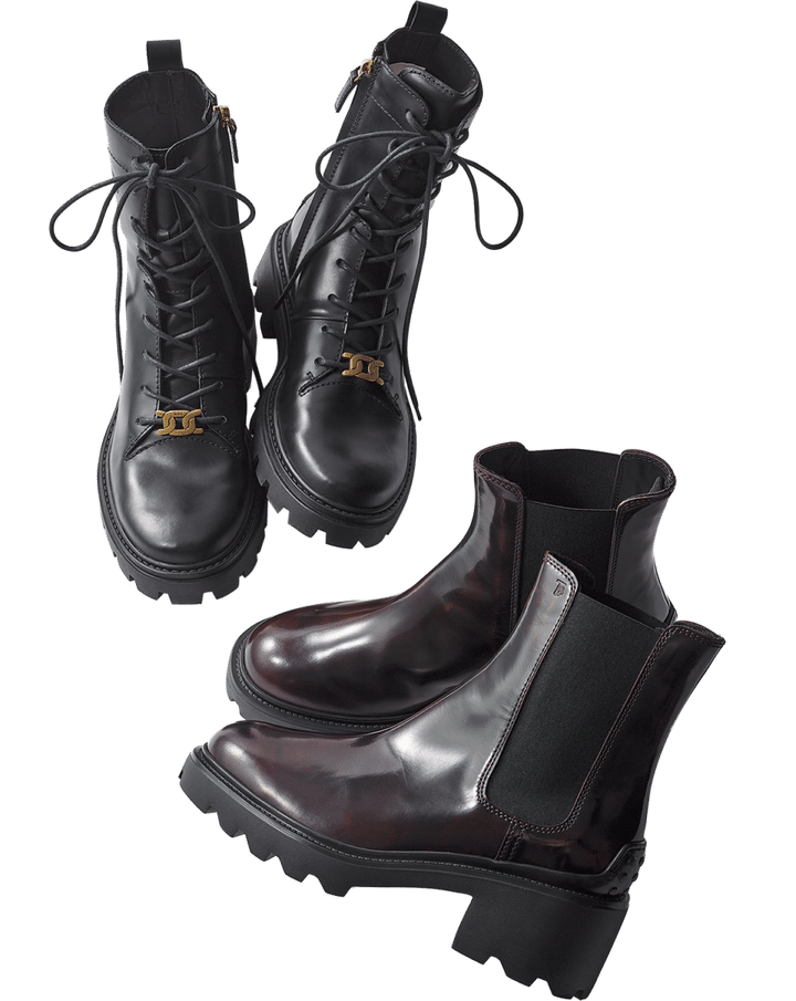 上から:レースアップブーツ[ヒール3.5㎝]¥149,600、サイドゴアブーツ[ヒール6㎝]¥119,900(共にトッズ/トッズ・ジャパン)