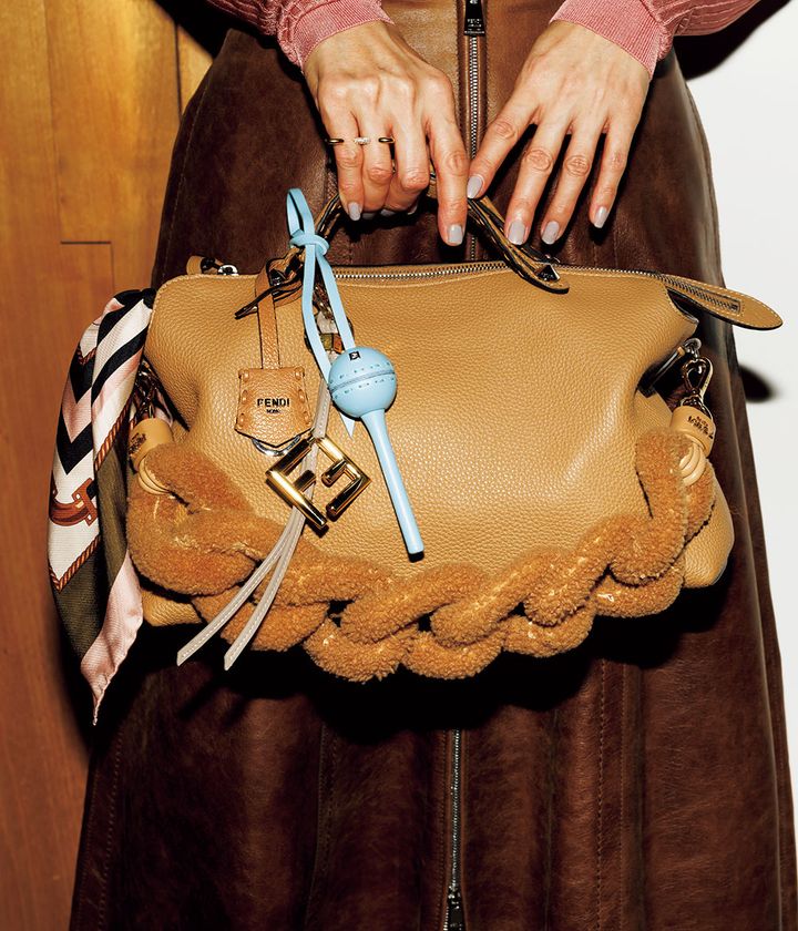 チェーンストラップ「ストラップ ユー ミニ」¥154,000 チャーム「フェンディ×チュッパチャップス ロリポップホルダー」¥90,200チャーム「FF ダイヤモンド」¥63,800スカーフ¥71,500バッグ「バイ ザ ウェイ セレリア ラージ」¥453,200レザースカート¥715,000リング¥63,800(すべてフェンディ/フェンディ ジャパン)