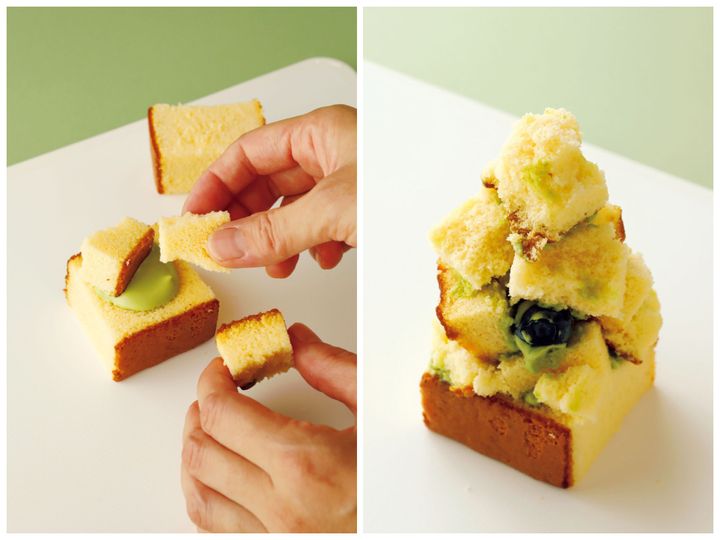 (2)カステラ2切れは5cm四方に切って、土台にする。残りは1~2cm角にちぎり、(1)をつけながら、ブルーベリー4~5粒とともに山形になるように積み上げ、2つのケーキを作る。