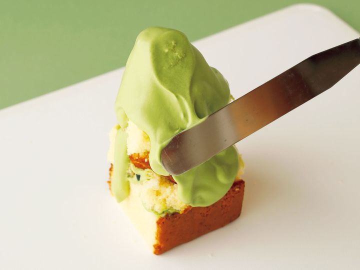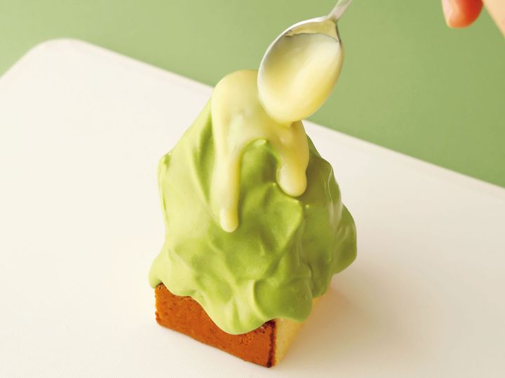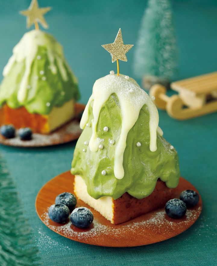 カステラに抹茶クリームをたっぷり塗り、白いソースをドリップすれば、雪が積もったツリーのようなかわいケーキに。見た目もはなやかで、テーブルをパッと明るくしてくれるはず!
