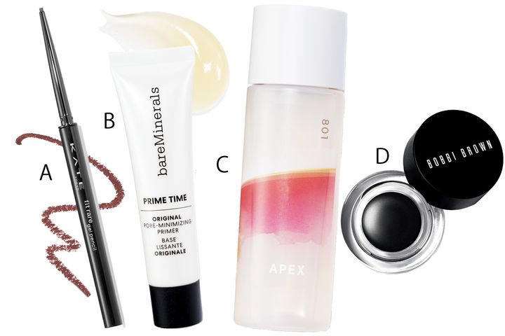 A.とろけるような描き心地ながら、秒速密着するジェルペンシルライナー。ケイト レアフィットジェルペンシルN BR-1 ¥1,210(編集部調べ)(カネボウ化粧品)B.気になる毛穴や凹凸をカバーして、均一な肌に。メイク崩れもブロック。プライム タイム オリジナル ポア 30ml ¥4,950(ベアミネラル)C.乾燥しがちな肌にたっぷりの潤いを与えるオイル美容液。みずみずしいテクスチャーがすっと浸透。アペックス バランシングオイル 35ml ¥9,900(ポーラ)D.濃密なジェルがピタッと密着し、繊細なラインも思いのままに描ける。速乾性抜群&長時間安心のウォータープルーフ。ロングウェア ジェルアイライナー ブラックインク ¥4,620(ボビイ ブラウン)