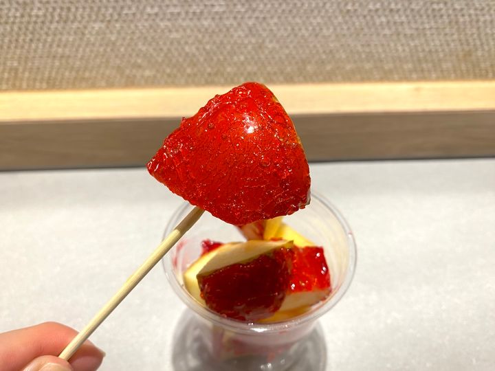 「やおりんCafe」のリンゴ飴は、リンゴ本来の味をよく感じられるのが特筆すべきところ。パキッとした食感のあと、口いっぱいに果汁がジュワッとあふれ出し、リンゴの甘さとみずみずしさを楽しめます。飴の甘さが控えめなので、フルーツをそのまま食べている感覚に近く、すっきりとした後味で食べやすいです。