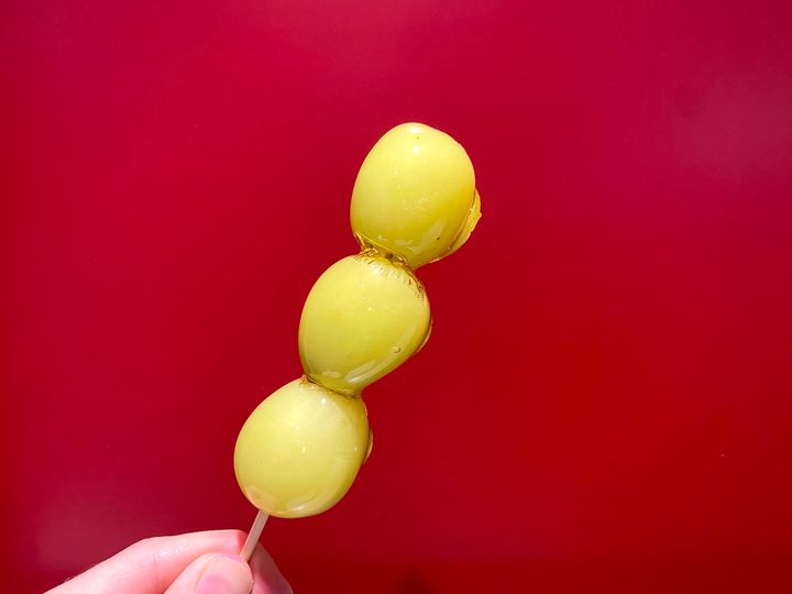 ミカン1個分が串に刺さった「みかん飴」は、果汁のジューシーさが魅力。パリパリの飴を割った瞬間、の粒が弾けて果汁がたっぷりあふれ出てきます。さわやかな甘みが一気に広がってキュン!