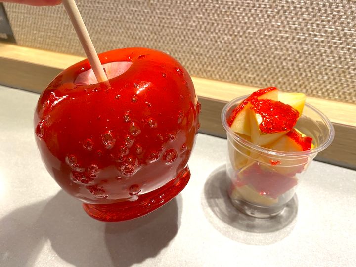 リンゴ飴だけは、カップとホール(1玉)の2種類を展開。カップは1玉の約3~4分の1のボリュームになっており、カットされているので食べやすいのがポイントです。また、飴とリンゴの食感のコントラストを感じやすいのもGOOD!