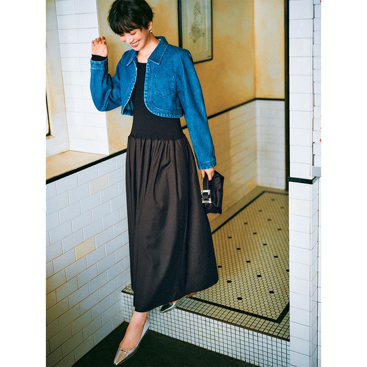 デニムジャケット¥49,500(DES PRÉS)ワンピース¥39,600(アダワス/ショールーム セッション)ピアス¥6,000(バナナ・リパブリック)バッグ¥118,800(セルジオ ロッシ/セルジオ ロッシ カスタマーサービス)パンプス¥68,200(ペリーコ/アマン)