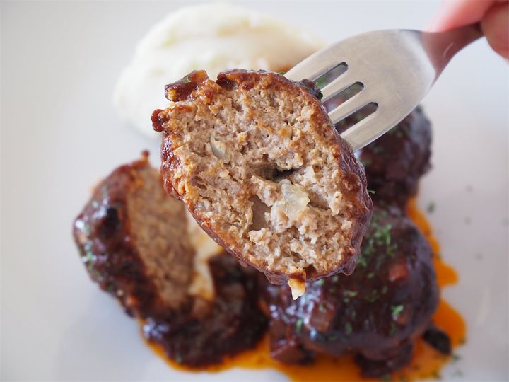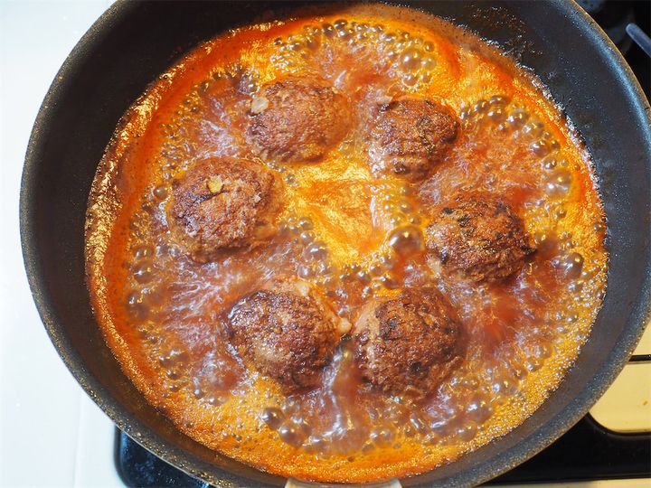 食べてみると、ソースを20分煮込んだだけとは思えないほど、まるで長時間煮込んだかのようなコク深い味わいです。市販のルウを少し使うことでこんなにも簡単にこの味わいが実現できるのでしょうか⁉︎でももちろん、ただルウを使っただけじゃ出せないような風味豊かな香りとおいしさ。トマトの酸味と赤ワインの風味を感じる本格的で味わい深いソースです。やわらかいミートボールと一緒に口に入れると、お肉の旨味も合わさって、これはたまらない!