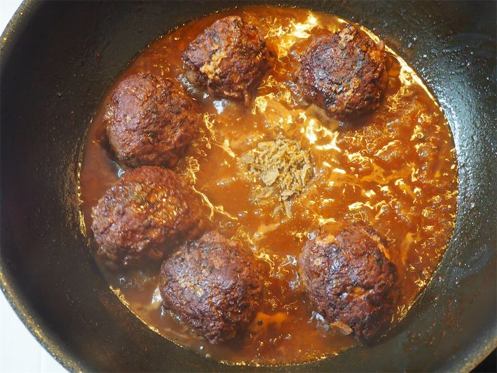 7. 20分経ったら5のフタを開け、6のルウを入れ溶かす。とろみが出たら、ミートボールに絡めて出来上がり。