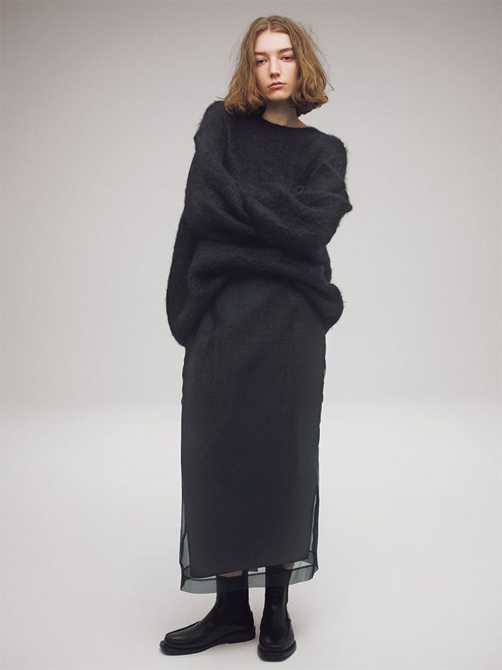 ニットのもこもことしたボリューム感に惹かれる反面、ボトムとのバランスも気になるところ。重量感とのつりあいを図りながらスリムに装える、キレイな黒スカートにフォーカス。