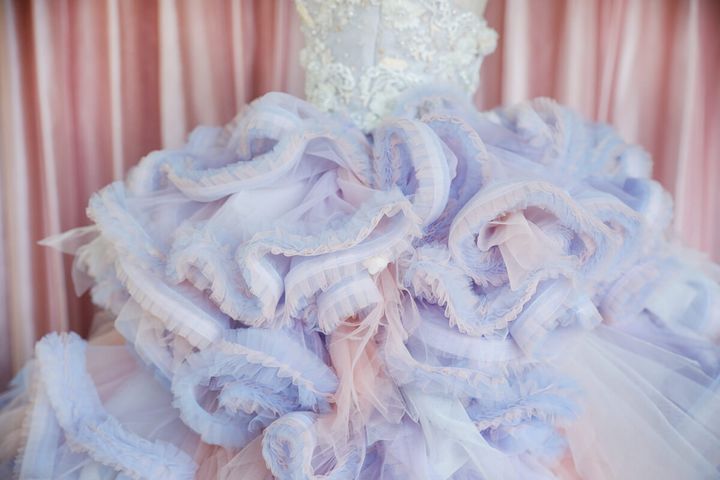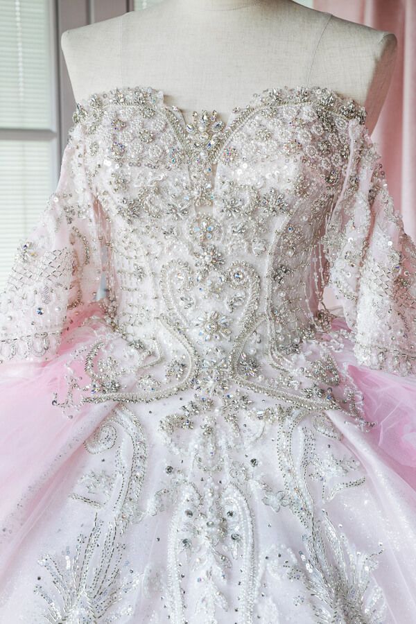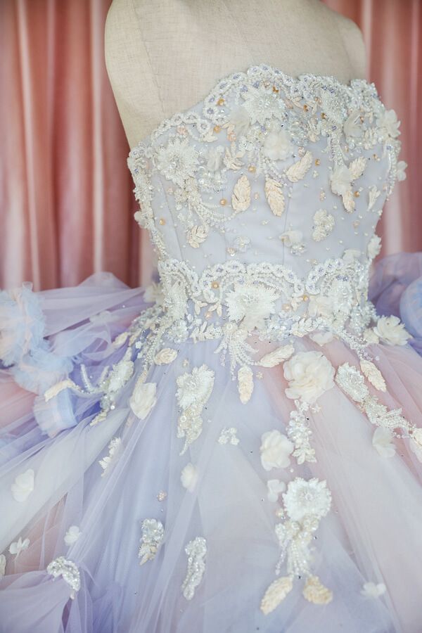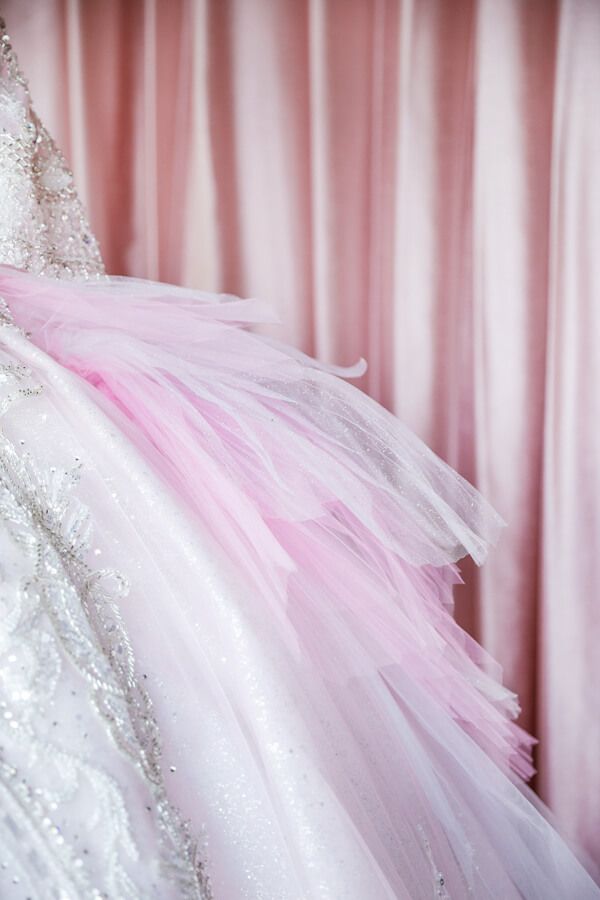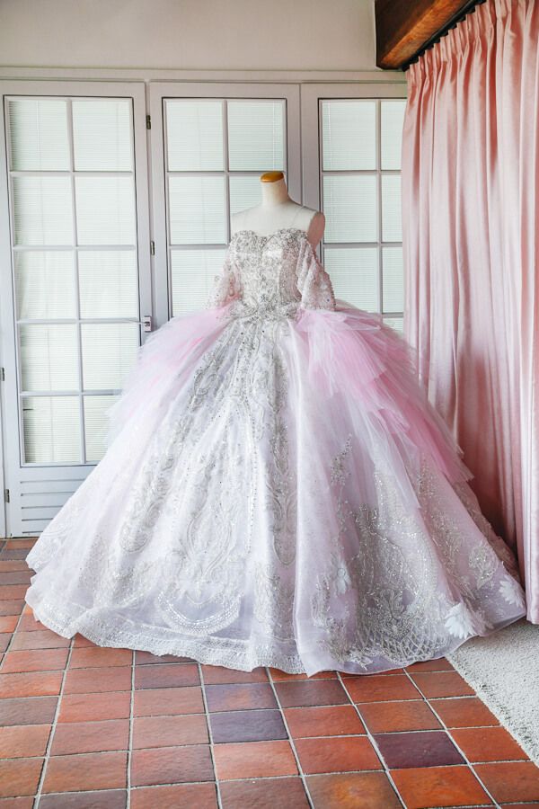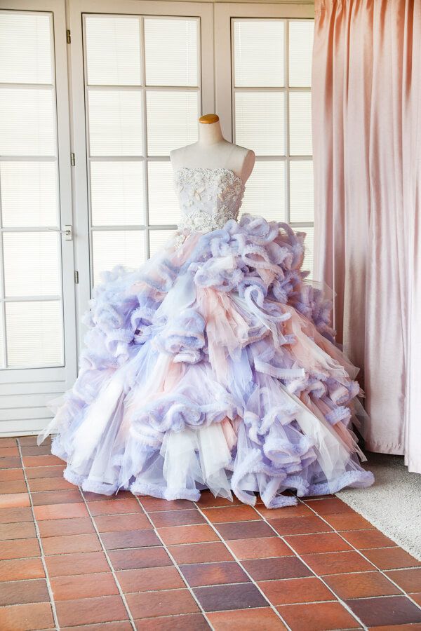 続いては、取材時点でまだ店頭にも並んでいなかった超新作ドレスのAurora(オーロラ)。「オーロラ姫のドレス?」かと思いや、デザイナーが夢に見た「ピンクのベールを纏ったピンクのウェディングドレス」から着想を得ているそう。チュールと布を何層も重ねて生まれる、幻想的な美しさに思わずうっとりです♡