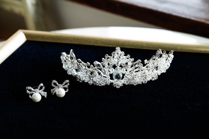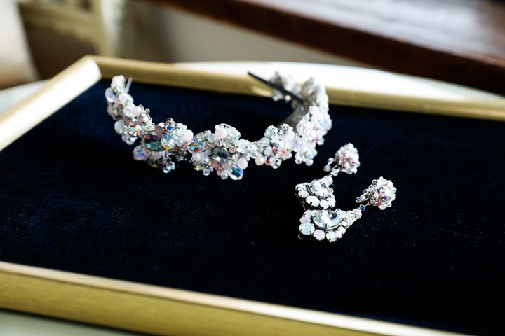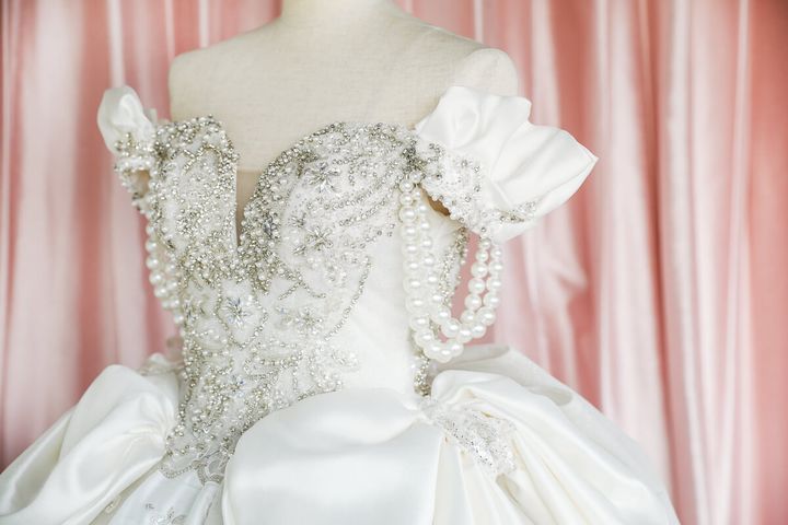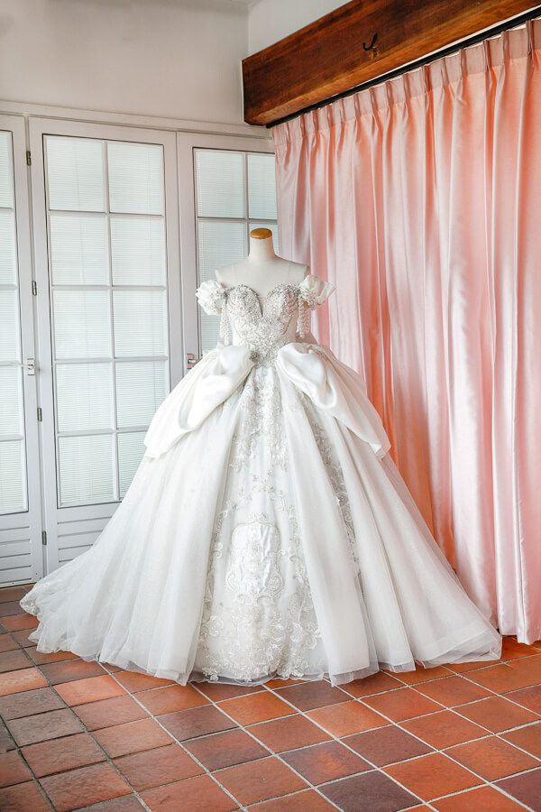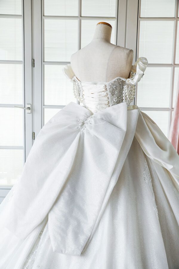 さらに、花びらのようなフリルと大ぶりのパールが揺れるオフショルダーのお袖がプリンセスオーラを加速♡ アクセサリーも王道のティアラがマッチしそうです♪