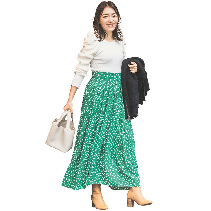 1週間仕事と育児をがんばったご褒美DAYの金曜日は、今やママ友になった学生時代の友人や仲良し同期と集まって、子連れNGのお店へ行くのが楽しみ。オシャレな人が集まる青山の「ベルコモ」へは、カジュアル軸の子連れでは選ばない白基調のコーデで。肩ぽわんニットに揺れるグリーンスカートを合わせて、立っても座っても可愛い甘オシャレでテンションUP! 斉藤まやさん(38歳・通信業 3歳男の子のママ)