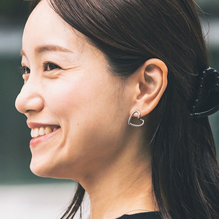 ピアスとヘアクリップをハートでリンク。オフィスより甘めに振って気分を盛り上げます。