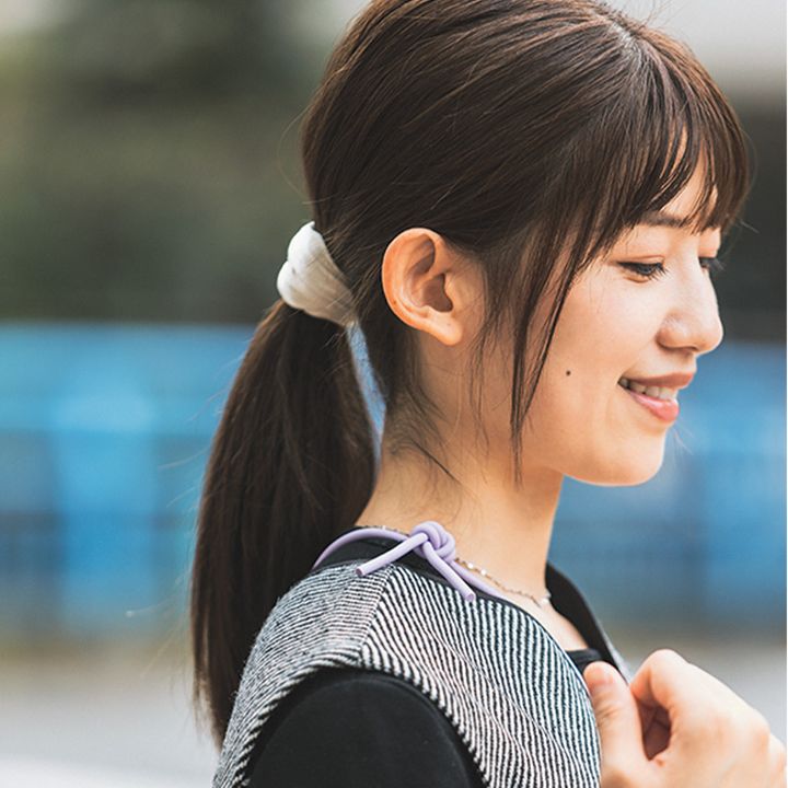スエード調のヘアタイやもこもこバッグで冬のオシャレを満喫します。