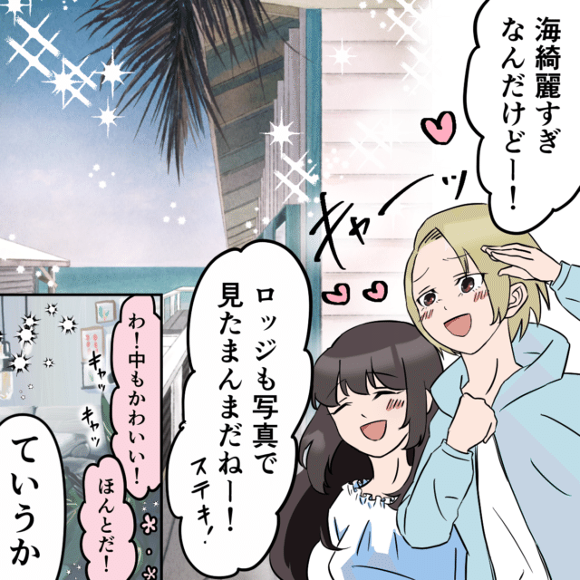 そして旅行当日に。「やばっ!海、キレイ過ぎなんだけどー!」「ロッジも写真で見たまんまだねー!」アユさんとサユリさんは、ロッジに到着しテンションが上がっていました。