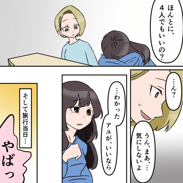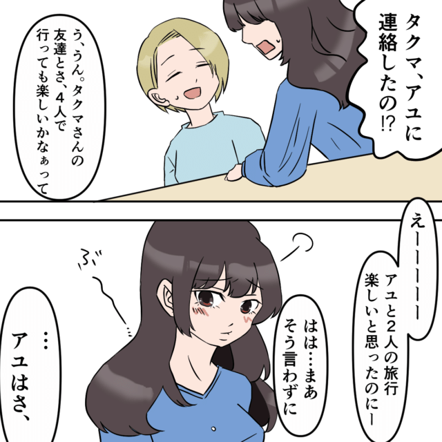 そして翌日のこと。「えっ?タクマ、アユに連絡したの!?」サユリさんの言葉に「う、うん。タクマさんの友達とさ、4人で行っても楽しいかなぁって」アユさんがそう答えると、「えーーアユと2人の旅行楽しいと思ったのにー」サユリさんが言いました。「はは・・まあ、そう言わずに」となだめるアユさん。