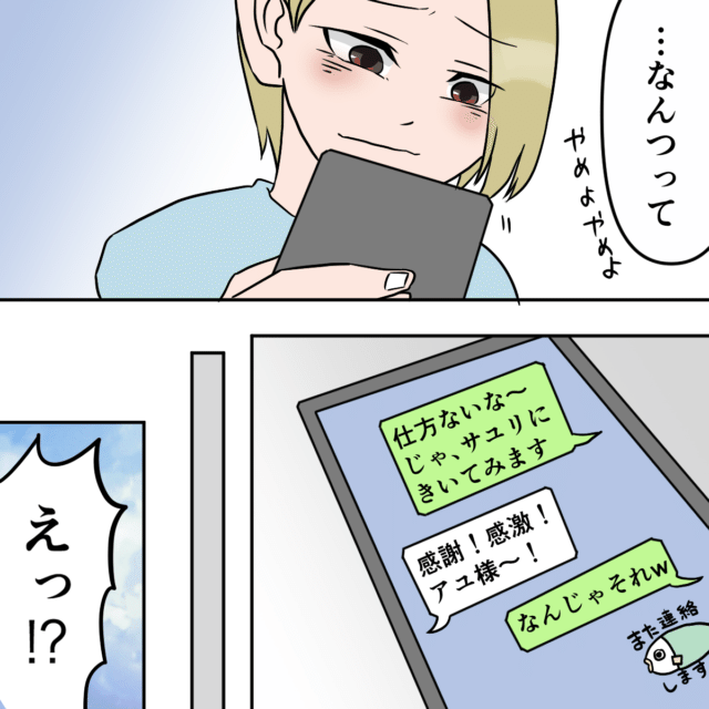 「かわいそうな俺を助けてくれよ~アユ様~」とタクマさんに言われたアユさん、「かわいそーなアユ様のことも助けてくれよー・・・」そう呟いた後で「・・なんつって」と「仕方ないな~。じゃ、サユリにきいてみます!」といつもの調子で返信しました。