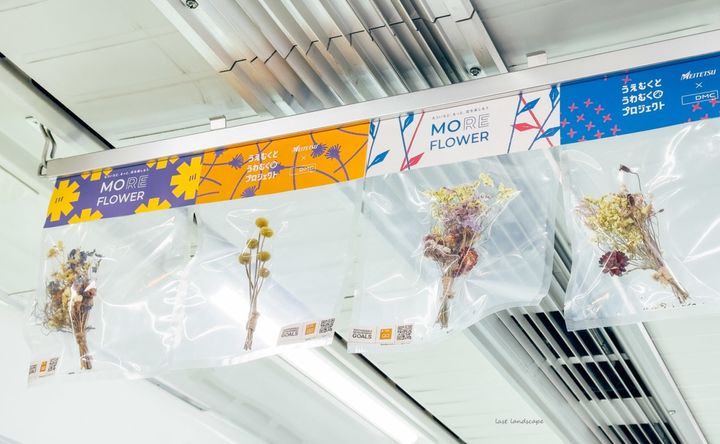 Last scapeさんが乗り合わせたのは、ドライフラワーの中吊り広告でした。規格外で売り物にならなくなってしまった花をドライフラワーとして真空パックにし、車内に掲示。終了後に再度回収し希望者に持ち帰ってもらう、という取り組みだそうです。混んでいる車内でふと上を見上げて、ドライフラワーの広告なら癒されますね。