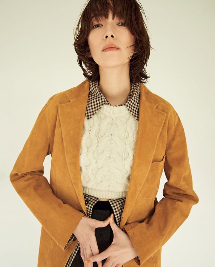 「スエードジャケットが欲しくて探していたら、まさかのメンズで発見。トゥモローランドが手がけるメゾン エ ヴォヤージュは、ちょっと女子が拝借して着たくなるおしゃれで粋なアイテムの宝庫。メンズブランドなのでテーラリングも綺麗だし、一枚仕立てで軽くしなやか。サイジングもちょうどいい。明るいスエードの色が可愛いので、同系色のシャツにショートニットでレイヤリング」