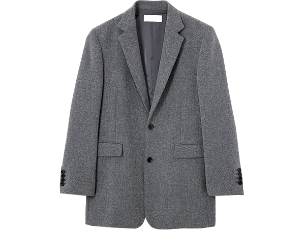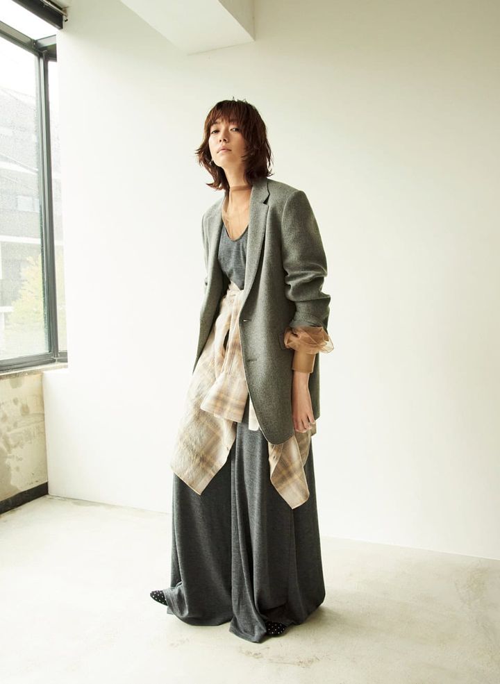 「普遍的なテーラードを、今の気分でスタイリングできるよう、着丈長めのオーバーサイズで作ったというジャケットは、コート感覚でも使えちゃうなと思った一着。余裕のある丈感に対し、肩幅は比較的ジャストで作られているから、女性らしい美しさがある印象。少しふくらみのあるぎゅっと密度が詰まったグレーの生地、裏地もしっかりあって、こういうジャケットはすごく好き。Tシャツにデニムでもいいんだけど、グレーとベージュを組み合わせて面白く。引きずるくらい長い丈のオールインワンがポイント!」