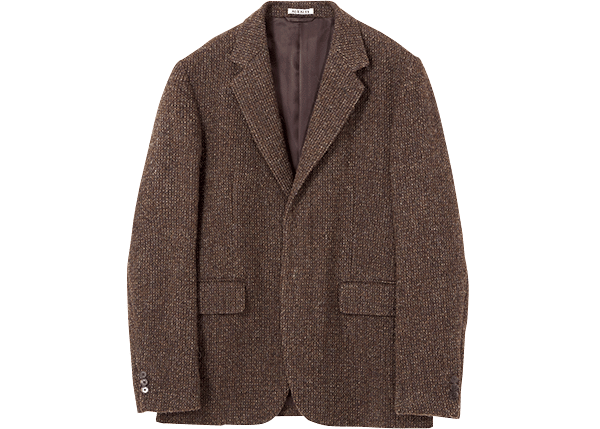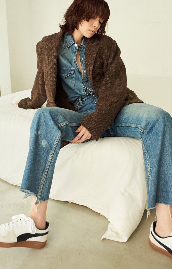 「オーラリーはジャケットに限らず、オーセンティックなアイテムを“なんか今っぽく”仕上げてくるのが天才的にうまい。このツイードジャケットも、クラシカルなルックスでいて、ちょっとした気のきかせ方を、しまくってくれているんだよね。自分になじませて気負いなく着こなせるから、それが野暮ったくならずおしゃれに見える。ちなみに、アルパカ混なので軽くて暖かい着心地も◎。大胆に胸元をあけてセンシュアルに着こなしたデニムオンデニムの足元は、話題のスニーカー、プーマのパレルモで旬度を加速」