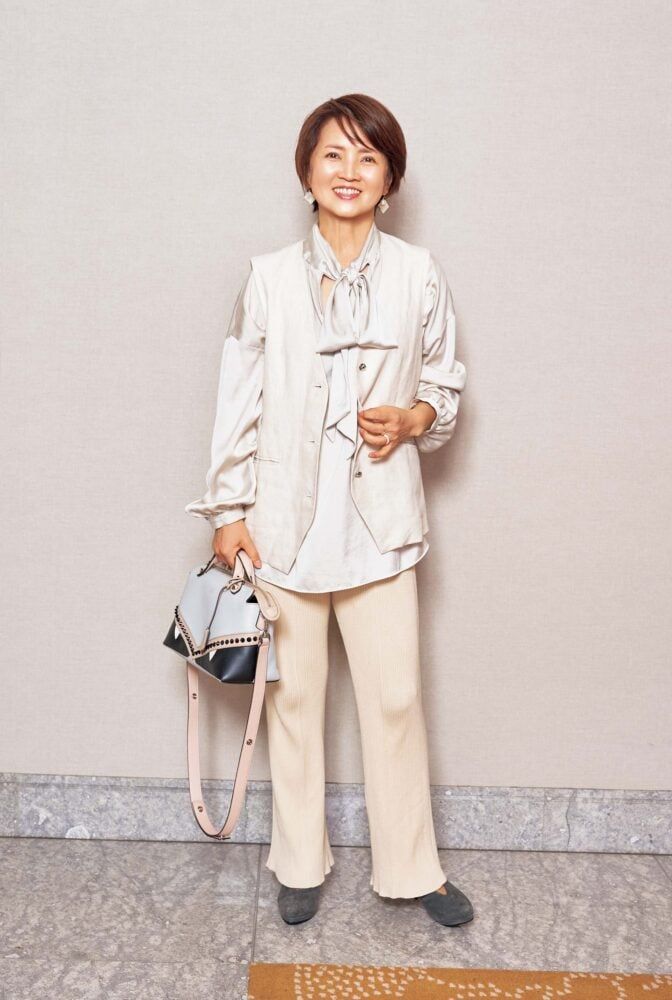 きれいめカジュアル好きの門田美由紀さんは、「ウィムガゼット」のシャイニーブラウスに「ジャーナルスタンダード」のジレ、「ガリャルダガランテ」のパンツなど、異素材アイテムを合わせてこなれたワントーンスタイルに。ジュエリーは盛り過ぎないのがマイルール。