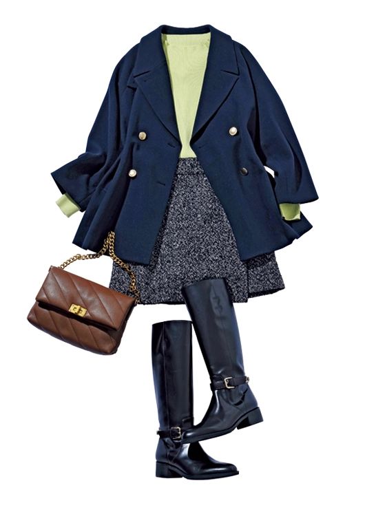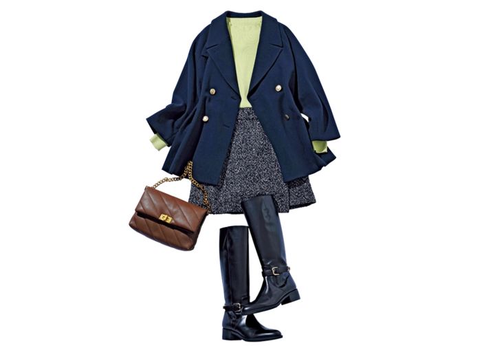 ピーコート¥12,980/グローバルワーク(アダストリア) ジャンスカセット(ニット)¥15,994/NATURAL BEAUTY BASIC ツイードセットアップ(スカパン)¥18,700/アルページュストーリー キルティングバッグ¥17,050、ロングブーツ¥39,600/ダイアナ(ダイアナ 銀座本店)