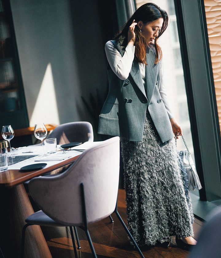 スカート¥19,800(SNIDEL/SNIDEL ルミネ新宿2店)ジレ¥39,000(シーニュ)ニット¥24,200(アナイ)バッグ¥165,000(J&M デヴィッドソン/J&M デヴィッドソン カスタマーセンター)パンプス¥41,800(PIPPICHIC/ベイジュ)ピアス¥31,900(プラウ)