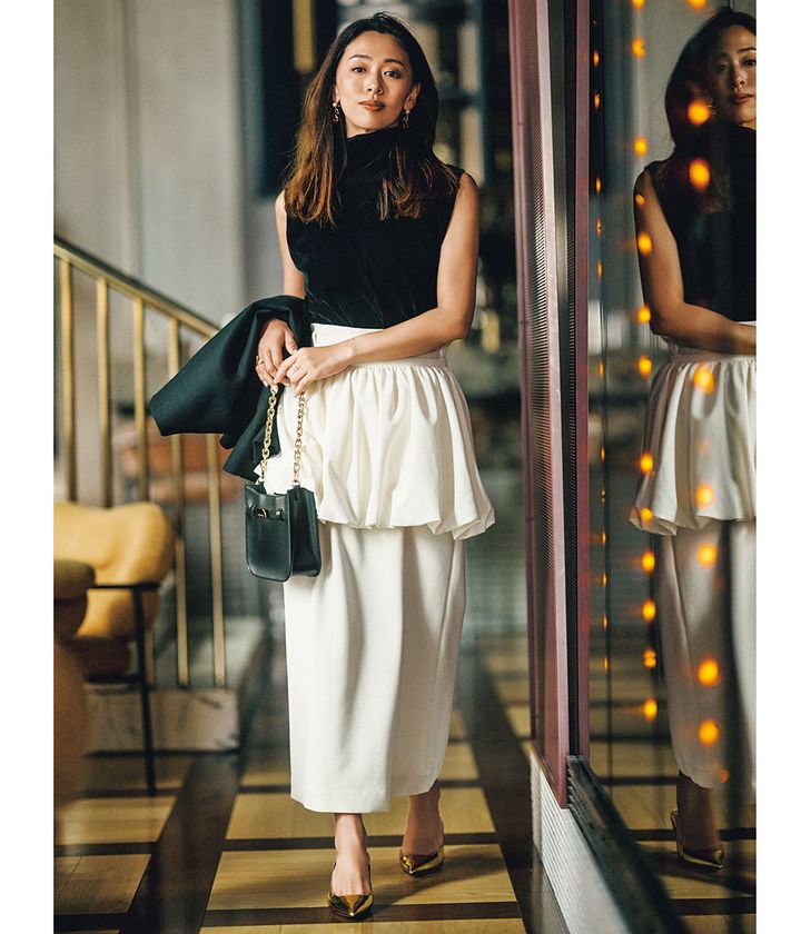 ミニスカート¥55,000(ボーフィー/ユナイテッドアローズ 六本木ヒルズ店)タイトスカート¥20,900(リエス)ベロアトップス¥15,400(アルページュストーリー プレスルーム)手持ちしたジャケット¥99,000(アキラナカ/ハルミ ショールーム)バッグ¥11,900(CHARLES & KEITH JAPAN)ミュール¥72,600(ペリーコ/ウィム ガゼット 青山店)ピアス¥72,600(カラットアー/イセタンサローネ東京)リング[右手]¥22,000(オーロラ/ロードス)リング[左手]¥53,900(アナプノエ/フォーティーン ショールーム)