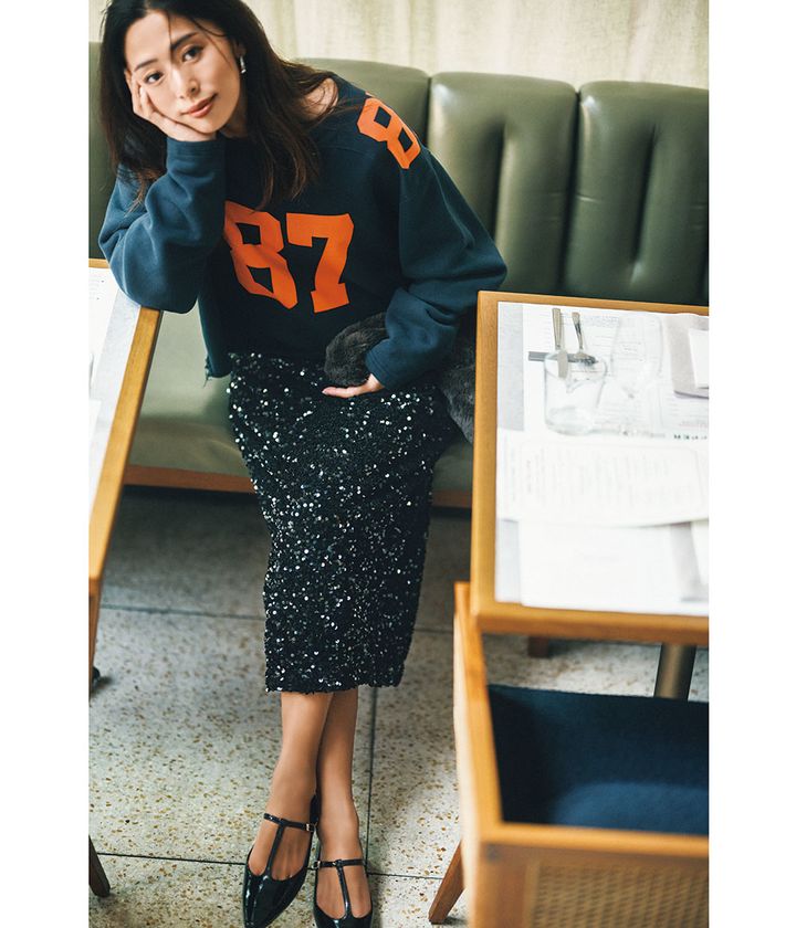 スカート¥24,970(ネイヴ/オンワード樫山)スウェット¥28,600(SEA/エスストア)バッグ¥8,990(PLST)パンプス¥17,050(ダイアナ/ダイアナ 銀座本店)ピアス¥62,700(ミチ ウィルウェイ/フォーティーン ショールーム)