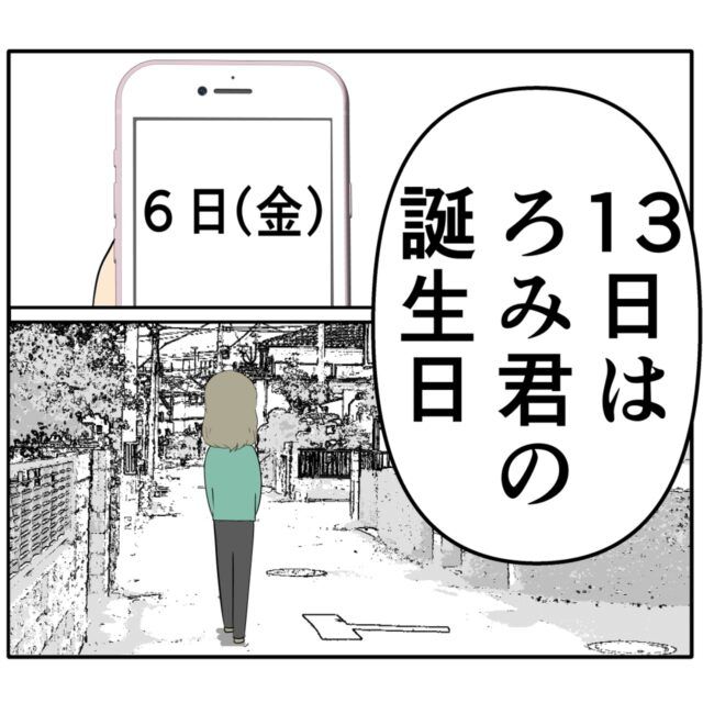 めいさんの姿を確認したジュリ実さんは、帰りながらスマホで日付を確認。この日は6日の金曜日でした。ジュリ実さんは「13日はろみ君の誕生日」と呟きます。