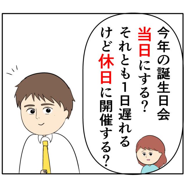 めいさんは「今年の誕生日会、当日にする?それとも1日遅れるけど休日に開催する?」とろみ緒さんに聞きました。