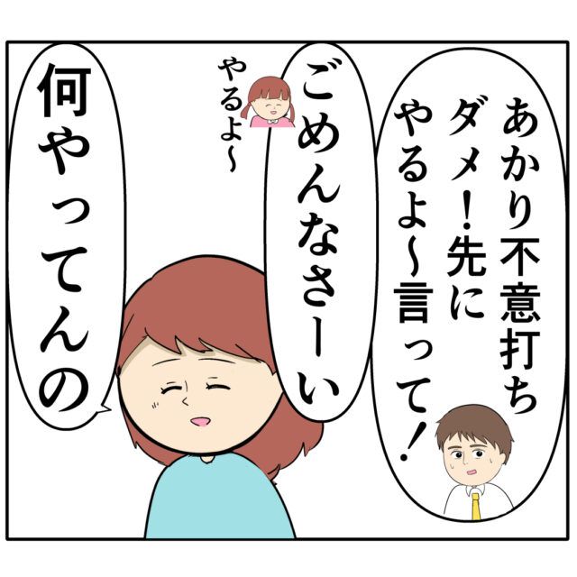 「あかり不意打ちダメ!先にやるよ~言って!」と優しく注意すると「ごめんなさーい。やるよ~」と笑顔で謝るあかりちゃん。2人のやり取りを見て「何やってんの」とめいさんが笑います。