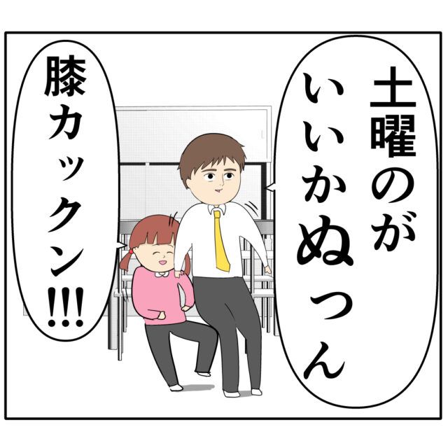 「土曜のがいいかな」と答えかけたろみ緒さんは、突然体勢を崩しかけて驚きます。娘のあかりちゃんがろみ緒さんに膝カックンをしたのです。