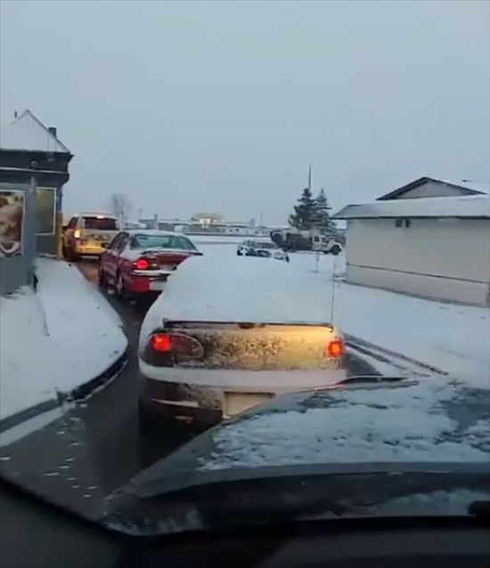 場所は、カナダのとあるお店のドライブスルー。 雪が降り積もっていてかなり寒そうです。 そのためか、車もかなり並んでいます。