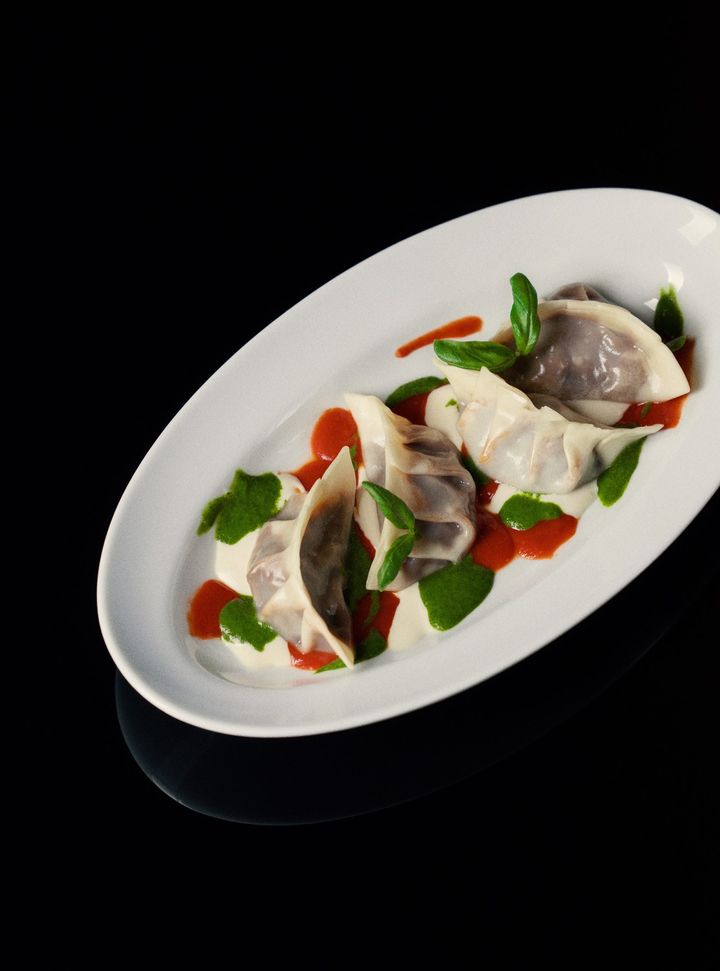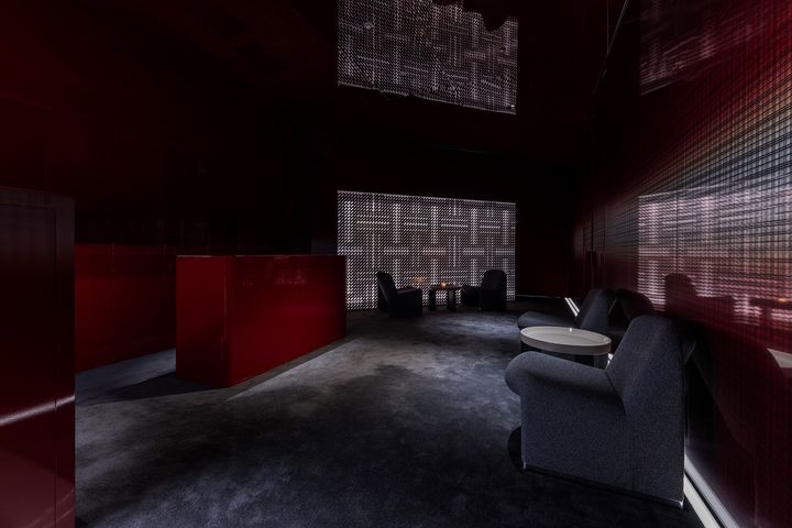 テーブル席には、イタリアンデザインの黄金時代を代表する5つの製品を復刻したグッチのスペシャル プロジェクト「DESIGN ANCORA(デザイン アンコーラ)」で甦ったTacchini x GUCCI “Le Mura”のソファが配置され、グッチのシグネチャーカラー「ロッソ アンコーラ」のシャイニーレザーが存在感を放っています。