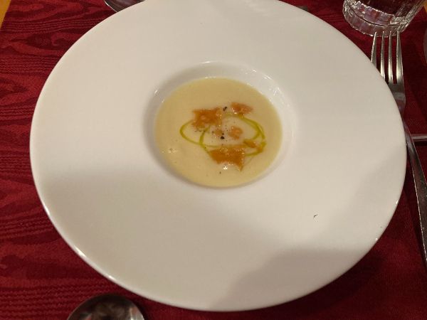 はじまりは、パルミジャーノのチップスで飾られた玉ねぎのポタージュから。 玉ねぎの甘みと旨みを凝縮した濃厚スープです。