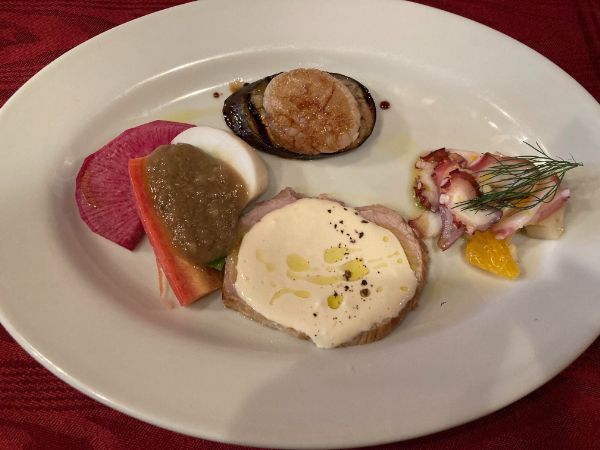 本日のアンティパストは、バーニャカウダ、茄子と帆立のグリル、蛸・ウイキョウ・オレンジのマリネ、豚ハムとツナソース。 一皿に、海、山、畑の恵みが詰まった盛り合わせ。 何を食べても美味しいとは、まさにこのこと。 お酒がお好きな方、ワインがぴったりですよ。