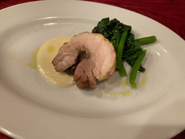 肉料理はポルケッタ。 柔らかくジューシーな肉質です。 詰められているのはきのこのペースト、深い香りと味わいが広がります。