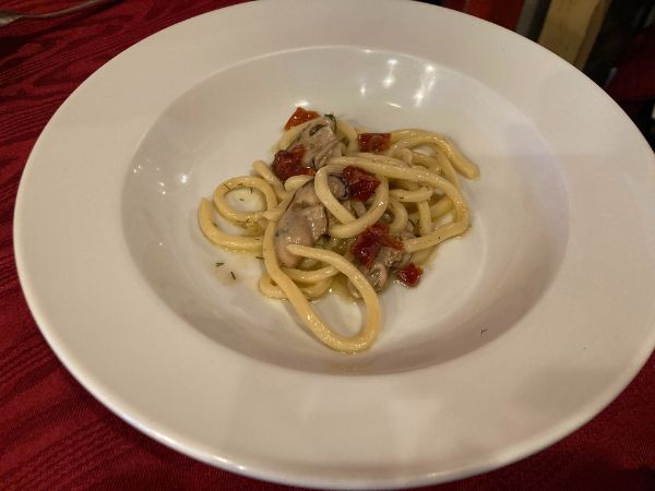 ひとつ目のパスタは、牡蠣のアーリオオーリオ。 トンナレッリという太めのパスタが、絶妙な食感です。 自家製のフォカッチャもはずせません。