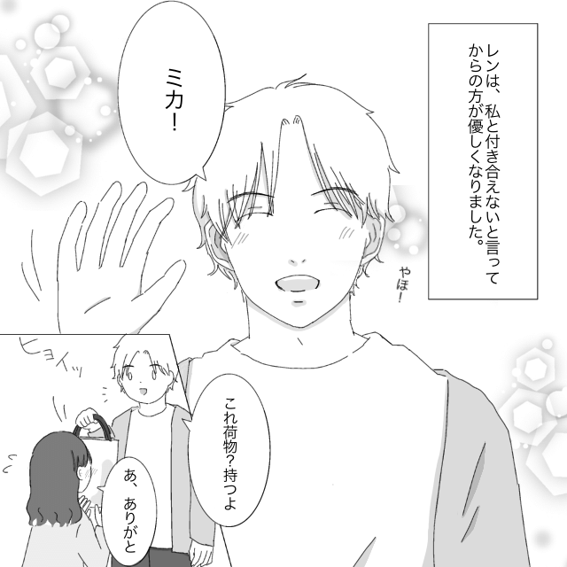 「ミカ!これ荷物?持つよ」「あ、ありがと」レンは、私と付き合えないと言ってからの方が優しくなりました。