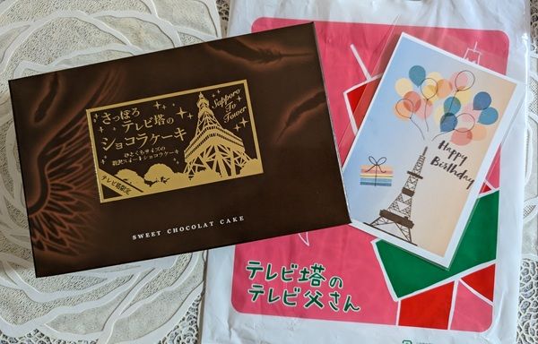 かわいいテレビ塔のバースディカードとショコラケーキ。カラフルなテレビ父さんの袋に入っていて、ちょっと嬉しい!