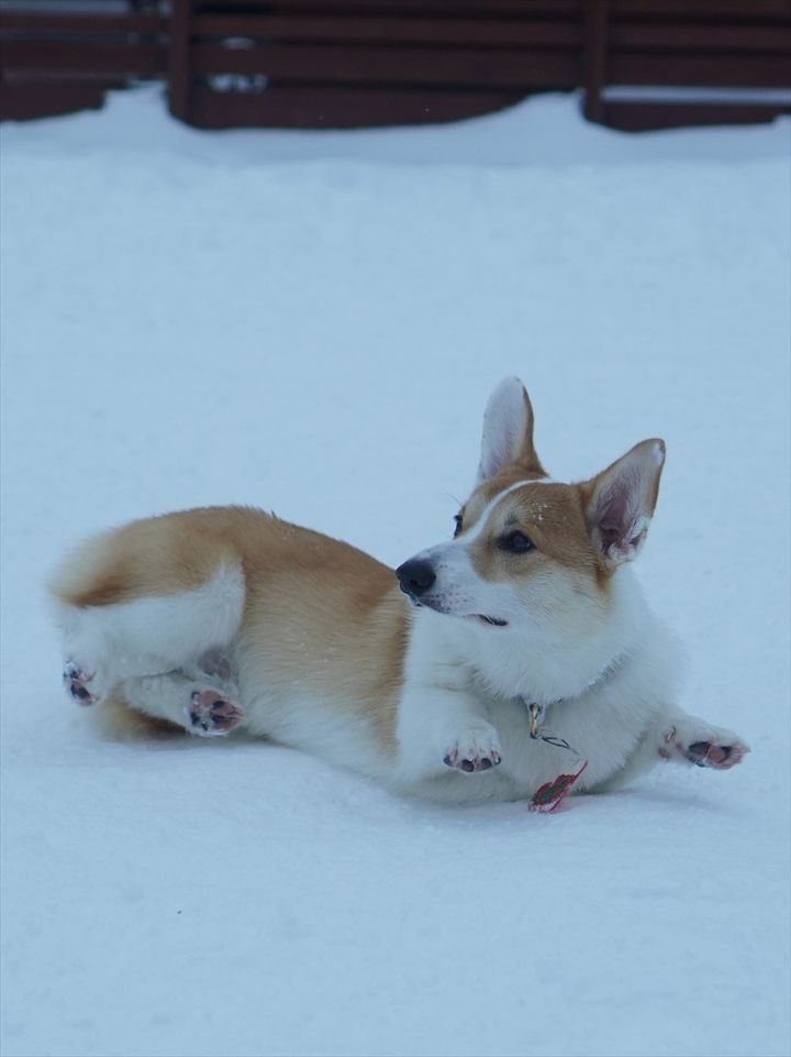 雪上で楽しくめいっぱい遊んでいたらしいりきたくん。 しかし、手足が冷えてしまったようで、その手足をつくのも嫌なようです。 手足が雪につかないように頑張って浮かせています。