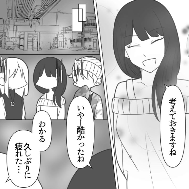 結局女性陣だけで飲み直すことにした3人。ストーカーに借金まみれ、そしてモラハラと三者三様にヤバエピソードを持っている男性陣との合コンを酒の肴にすることでしょう・・・。