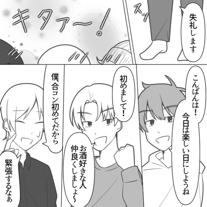 主人公のまなは友達2人と一緒に合コンに参加するようです。この日のお相手は全員サラリーマンで期待できそうと話しているところに男性陣がやってきます。