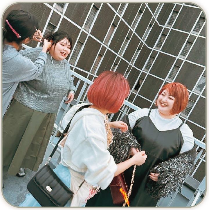 撮影中、黒のバッグも良いかも?とみんなでコーデのバランスを見ながらちょっと調整。やっぱり赤が差し色で良いね!でまとまり、赤のバッグに決定したのでした。