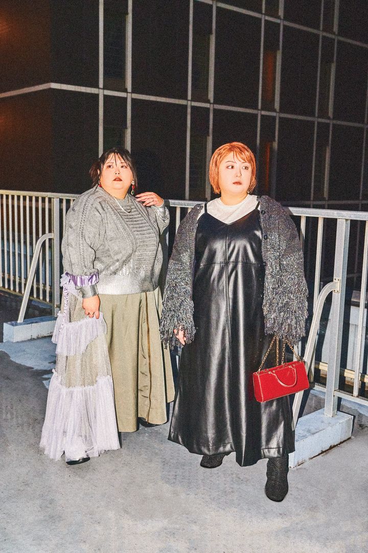 (右)ニットカーディガン フリーサイズ ¥29,700/J1U by LA BELLE ETUDE(アンティローザ) フェイクレザーキャミワンピース L~10L ¥9,889~¥10,879/GEVS.(スマイルランド) Tシャツ 1~4 ¥3,300/PUNYUS ピアス ¥3,590、ハンドバッグ ¥6,590/ZARA(共にザラ カスタマーサービス) ショートブーツ 23.5~26.5cm ¥7,590/la farfa SHOES