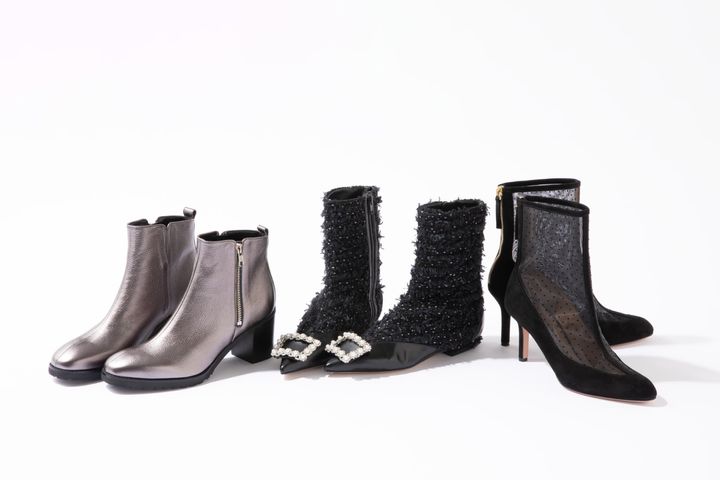 今年も昨年に引き続きショートブーツの人気が継続中。シルバーやゴールドのメタリック系に加えて、女性らしいツイードやメッシュ素材のものが多くみられます。足元で女性らしさを演出することでいつものスタイルに嫌味なくエレガントさを加えられます。