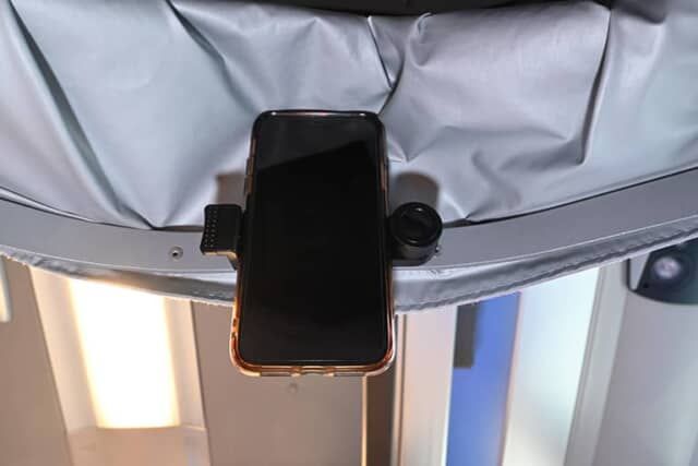 光が漏れるスマートフォンは、夜行バスでは使用禁止になることが多いのですが、大きなカノピーのおかげで利用可能。スマホホルダーは縦横どちらでも装着できて、使い放題はうれしいですね。