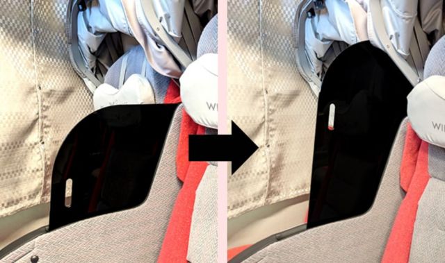 友人や家族同士で座るときは左側の写真のようにパーテンションを下げ、知らない人の場合は上げた状態に固定できます。